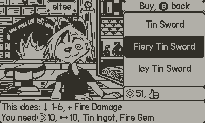 You could try to buy the Fiery Tin Sword at this point, but eltee would inform you that you’d also need a Fire Gem. Since you don’t have one, pick the ‘Tin Sword’ to buy it instead: